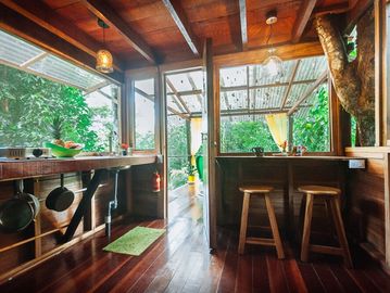 The very definition of eco- chic, this quaint one bedroom community home with a library and kitchen and an outdoor bathroom is a perfect place to unwind in the jungle. For anyone looking to find themselves off of the beaten path this is exactly the type of space that speaks to the adventurous nomad.